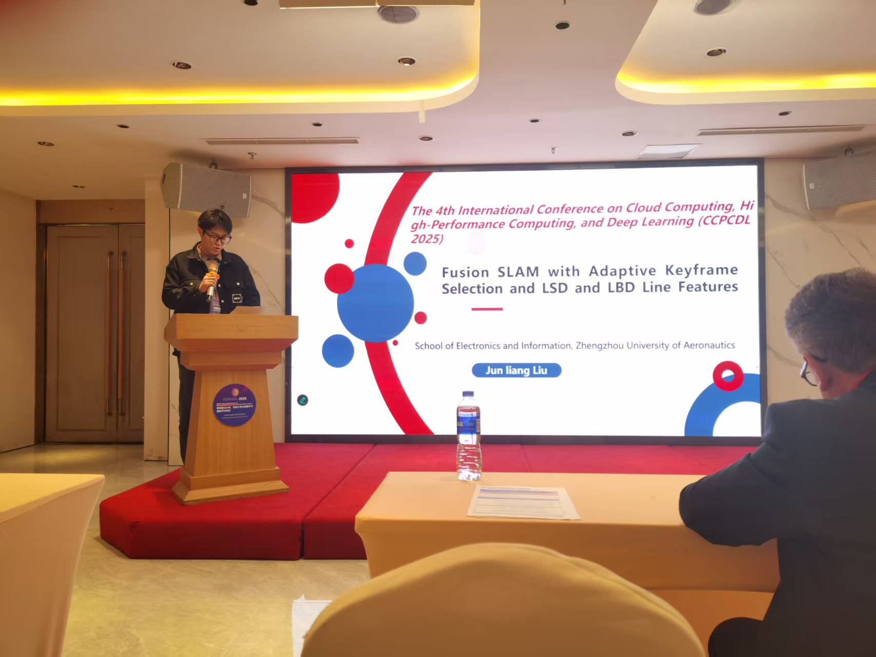 10月31日至11月3日,2024级新一代电子信息技术专业刘峻良同学参加了在上海举办的第四届云计算、性能计算与深度学习国际学术会议(CCPCDL2025),并在会议上以论文“Fusion SLAM with Adaptive Keyframe Selection and LSD and LBD Line Features”为题做口头报告。