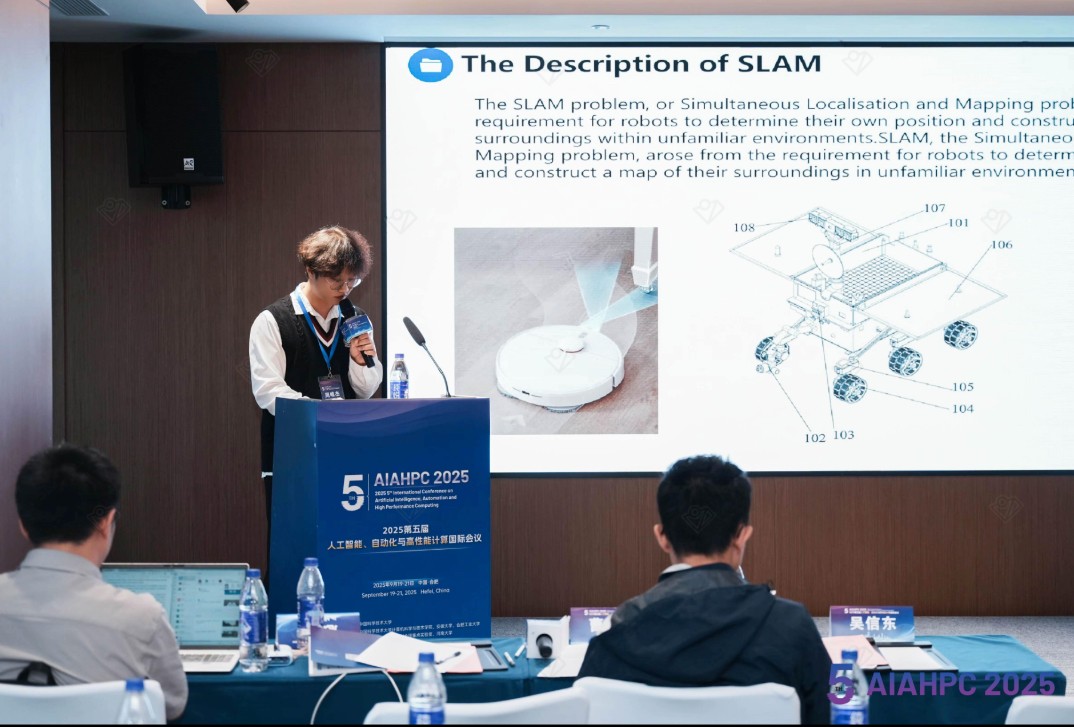 9月19日至22日,2023级通信工程专业周唯杰同学参与在合肥举办的2025第5届人工智能、自动化与高性能计算国际会议(AIAHPC 2025),并在会议上做了题为“一种结合光流去噪技术的极端环境视觉SLAM算法”(A Visual SLAM Algorithm for Extreme Environments Incorporating Optical Flow Denoising)的口头报告。