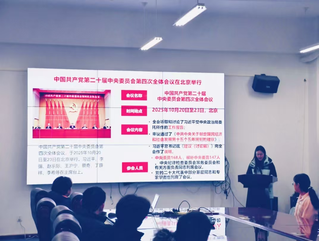 为深入学习宣传贯彻党的二十届四中全会精神,切实把全院团干部思想和行动统一到党中央决策部署上来,1月4日下午,郑州航院电子信息学院于06B202会议室举办专题宣讲会,院团委副书记刘姝晗做宣讲报告,会议由院团委负责人芮永要主持。
