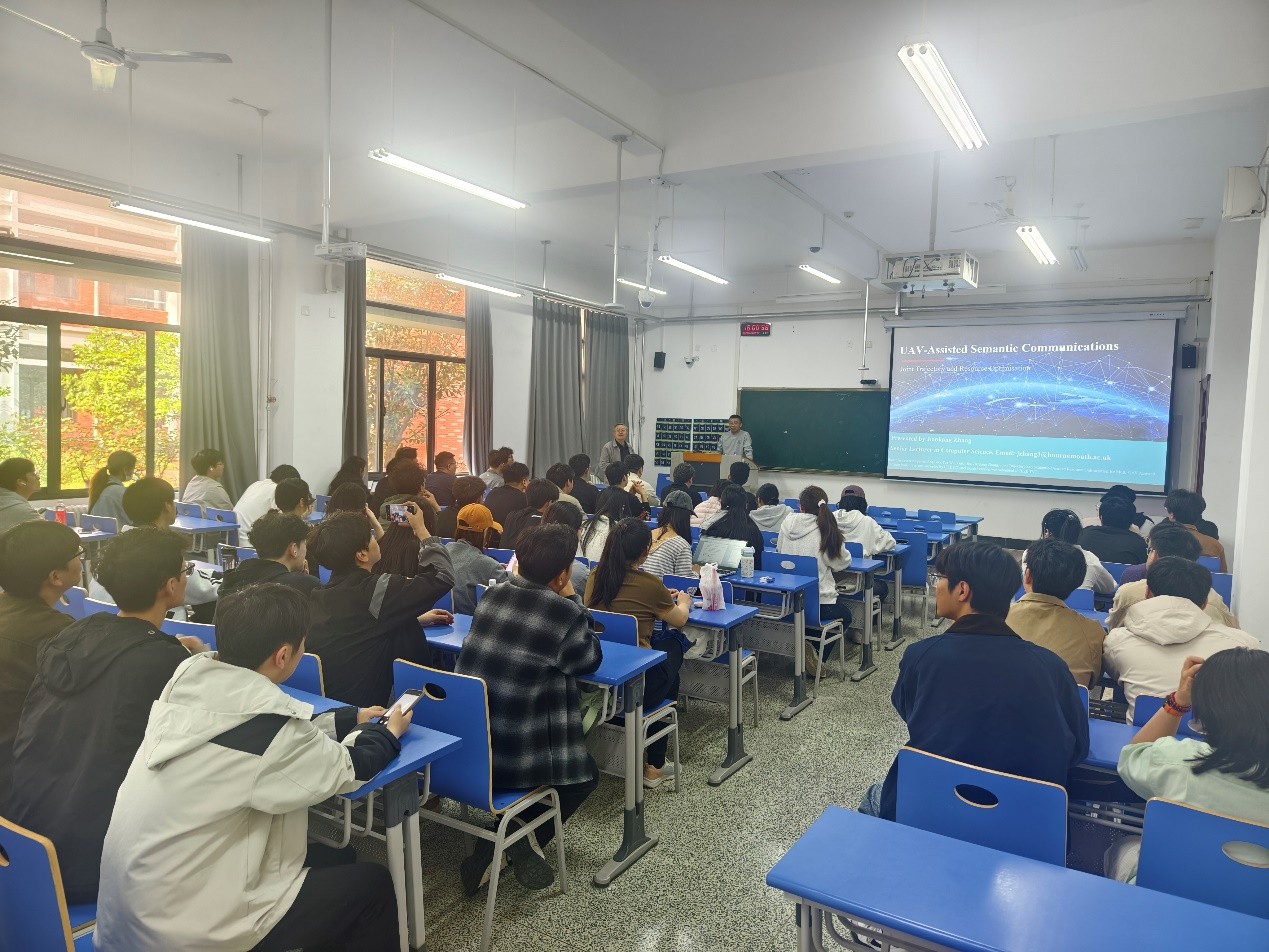 2026年4月9日,电子信息学院在03A119举办“智汇电信”学术论坛第十七场报告。本次论坛由学院马鹏阁教授主持,特邀英国伯恩茅斯大学(Bournemouth University)高级讲师张建康博士作题为《基于无人机的语义通信---轨迹和资源联合优化》的学术报告。张博士不仅系统梳理了无人机语义通信的技术原理与核心挑战,更通过联合优化模型的创新思路,为该技术在应急通信、偏远地区覆盖等场景的产业化应用提供了新路径,为师生在相关领域的研究与学习提供了重要参考。